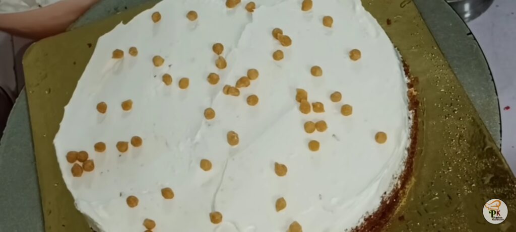 • Cut the 8 inch cake into 3 layers. Place the first layer in cake board and apply whipping cream and butterscotch crush. Cover the layer nicely and add caramel crunches.