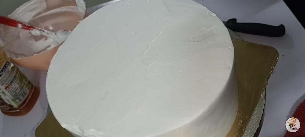 • Repeat the same process for the Oher two layers and do the same process for the 6 inch cake as well. Place the 6 inch cake on top of the bigger cake and spray golden glitter spray on sides as shown in video.