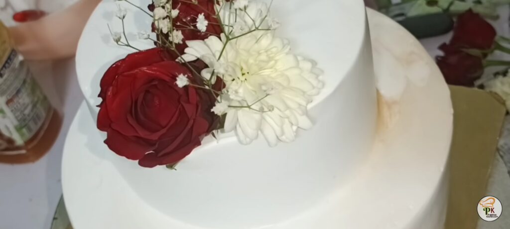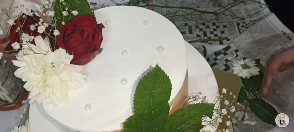 • Now place real flowers and sugar balls to decorate the cake as shown in video. Our simple and elegant looking 2 ½ kg cake is ready.