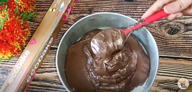 - Take a cake baking tin and line the bottom with Oddy Ecobake Brown. For 2 kg cake, take 700 grams chocolate premix, add 350 gm water, and 50 gm oil.