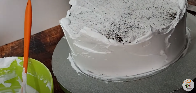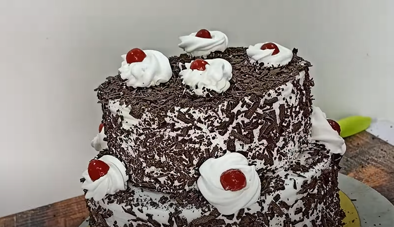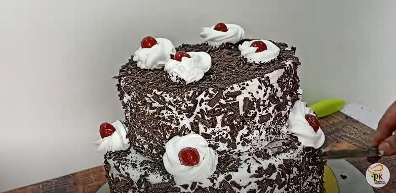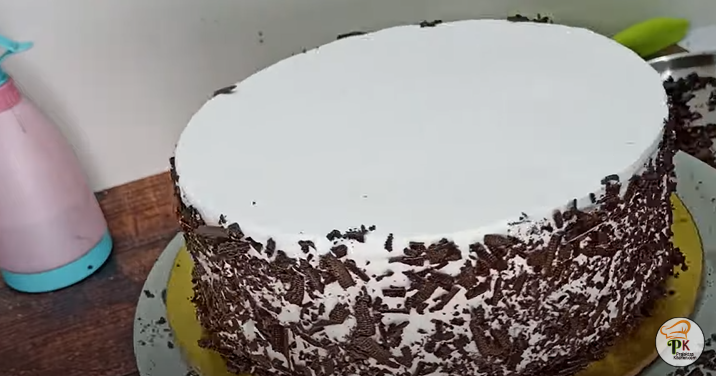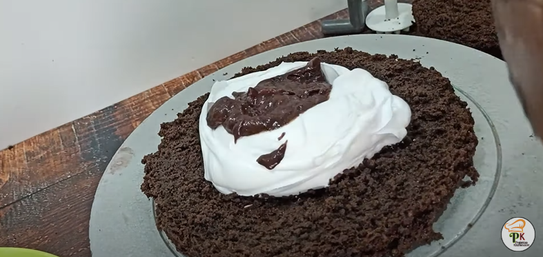 - Mix well and level the cream properly. Repeat the steps for rest of the cake. Crump coat the whole cake. Then complete the frosting.