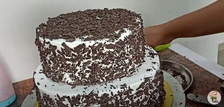 - Repeat the same steps and complete the small cake. Now apply and coat the cake with chocolate scrappings. Place the small cake in the big cake and coat it also with chocolate scrapings.