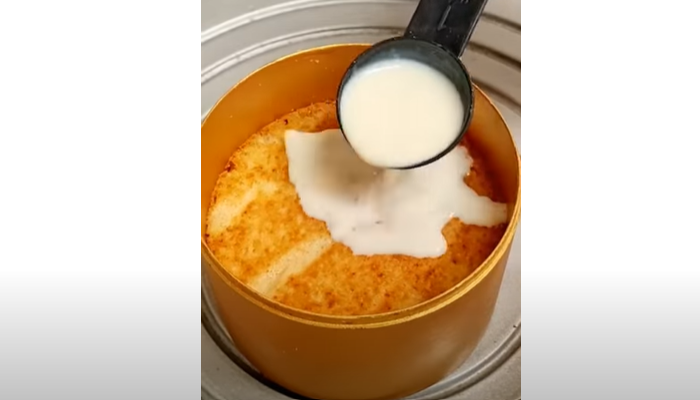 • Now take a box, place the cake sponge in it, and soak it in creamy milk prepared by condensed milk and milk. Apply whipping cream to the cake and spread it uniformly.
