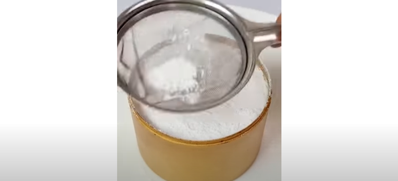 • Meanwhile, prepare white chocolate ganache and pour it over the refrigerated cake, garnishing it with powdered sugar as shown. Your 5-layer white torte cake is ready!