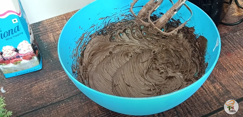 - In a bowl take 250 grams melted chocolate compound, 125 ml whipping cream, 2 tbsp hazlenut sauce. Whisk well with a beater till it increases to double its quantity.