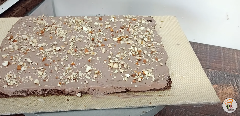 - Now place one layer on cake board along with the cut portion of fourth layer. Do the coating with sugar syrup and filling with chocolate Hazlenut mixture.