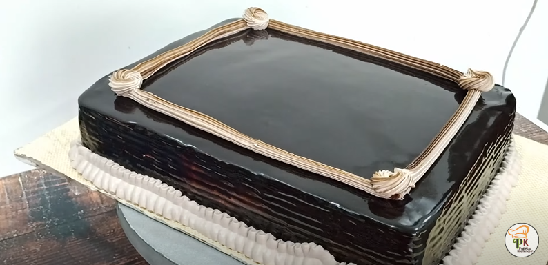 - With a traingle comb give the sides a pattern. Next prepare chocolate ganashe mixed with little milk to give it a liquid texture. Pour this on the cake and spread it gently with a spatula.