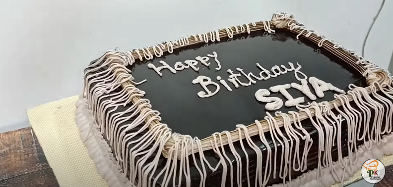 - Next take a piping bag and add the filing mixture and do the bottom border of the cake in the form of frills. Next take the same mixture in a pipping bag and N46 nozzle and make a rectangular border on the top of the cake.