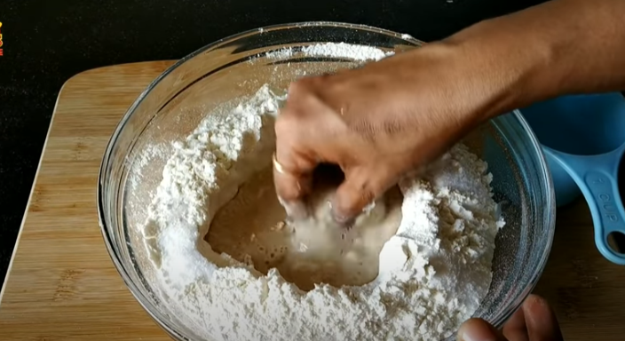 • Sift the all-purpose flour and place it in a mixing bowl. Cave the dough and add active dry yeast and sugar there. Mix them with warm water until the sugar melts completely.