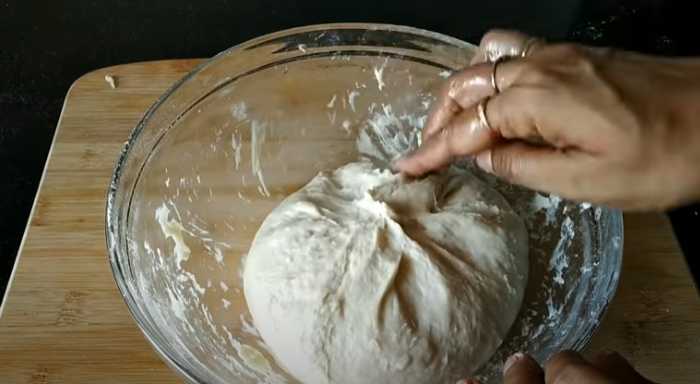 • Add salt to the dough. Add warm water gradually to it and knead for 5-7 minutes to make a soft dough. Add refined oil to it and knead. Seal the dough and grease with oil and water and let it rest.