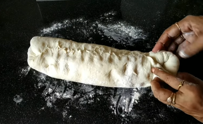 • Clean the kitchen top and dust with flour, then roll the dough flat. Press and remove the air bubbles. Fold and seal the dough as shown. Flip it over and transfer it to the loaf pan and press it.