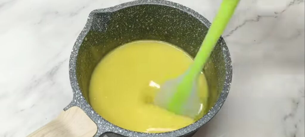 - In a mixer add peeled pineapple. Grind and make a puree. Strain to get fine puree consistency. Add sugar, corn flour, water and mix well. Place on stove and cook at low flame. Cook until thickens and transparent. Add yellow color and mix well. Pineapple glaze is ready.