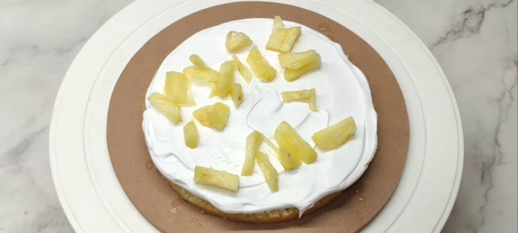 - Demold sponge. Trim upper layer. Slice sponge in three layers. Apply frosting on cake board. Apply pineapple sugar syrup. Add frosting and spread uniformly. Add pineapple slices. Place middle sponge layer and repeat the same process.