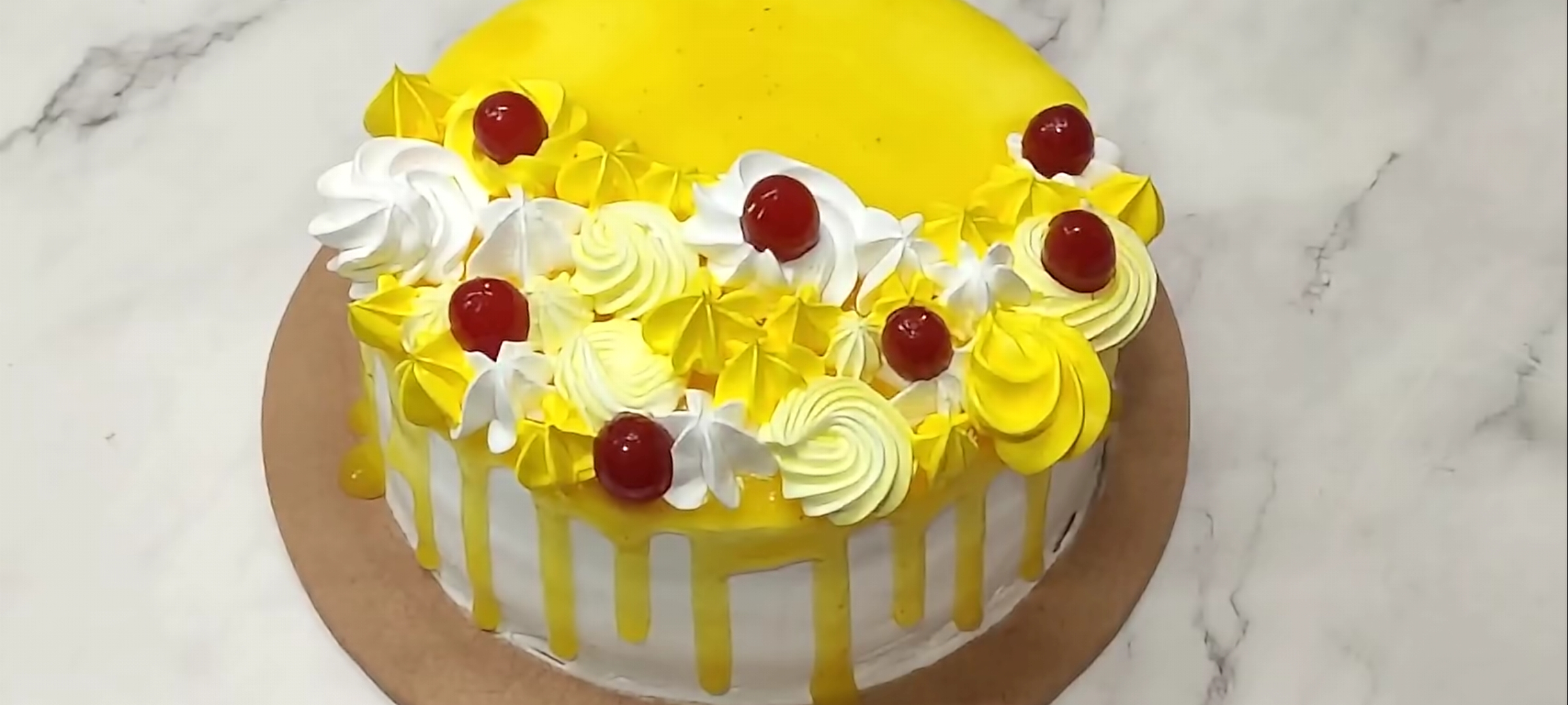 - Decorate with white and different shades of yellow frosting. Garnish with cherry. Our Bakery Style Fresh Pineapple Cream Cake is ready.