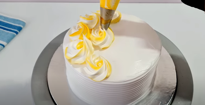 • Take a piping bag and apply two to three drops of yellow gel to its sides. Attach a 2D nozzle to it. Make 2 layers of rosettes on one side of the cake, as shown. Mix water, sugar, and corn flour in a pan and cook until it turns transparent.