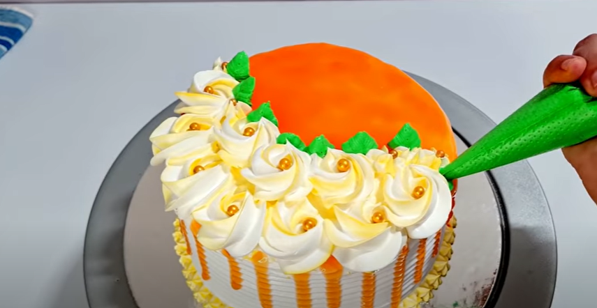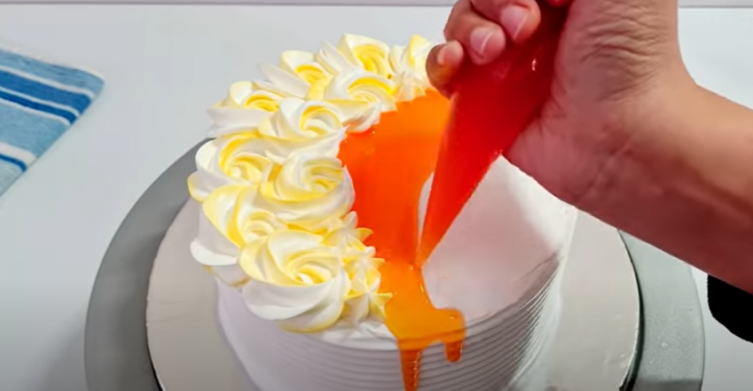 • Then add orange food gel and lemon juice to it to make an orange glaze. Decorate the other half of the cake with orange glaze as shown. Make leaf designs besides the rosettes with green cream.