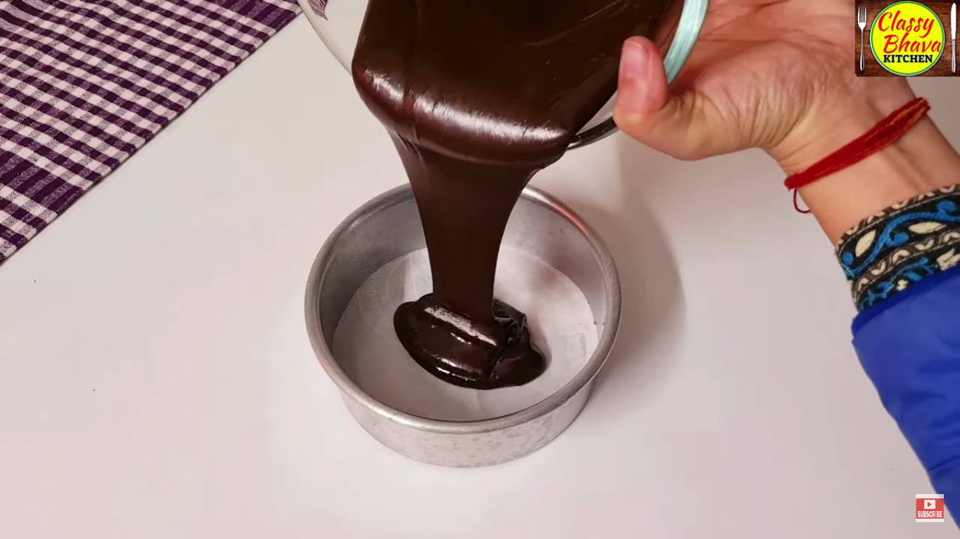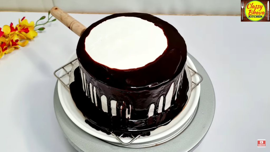 - Pour chocolate ganache on the meaning portion, so that it will cover the sides of the cake also, smoothen it using a spatula.