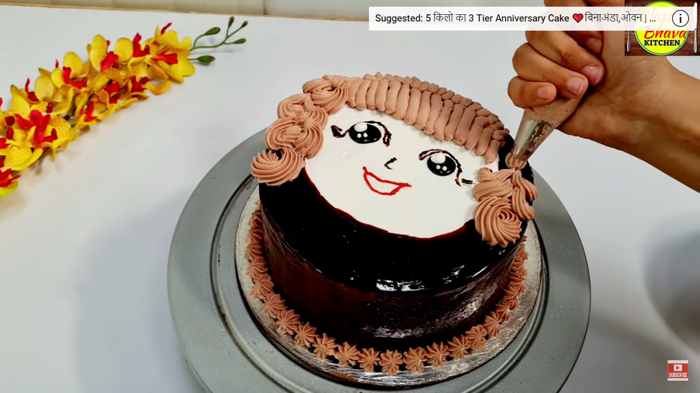 - Make hairs, and curly designs on the cake as shown, in the end make two flowers using the whipped cream and place them on hairs you made.