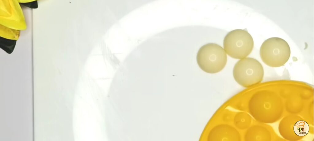 - Take melted white chocolate and pour it on bubble mold. Remove the excess and refrigerate for 10 mins. Once the bubbles are set demold it. Take a hot tin and take two halves of bubbles and place it on hot tin and fix to form a bubble.