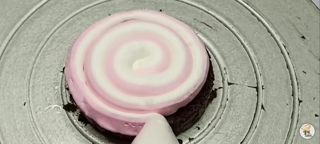 - Demold our cake and cut it into 4 layers. Fill the piping bag with half of whipping cream ganache. In the remaining whipping cream and pink food color and mix well. Add this to other half of the pipping bag.