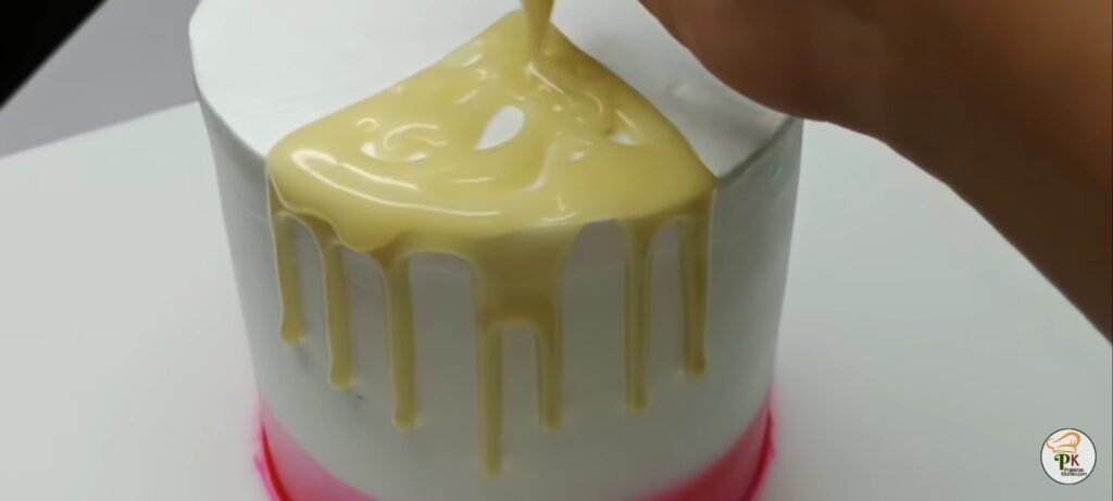 - Take golden dust and color the balls. Now add milk in the melted white chocolate bowl and mix well to make ganache. Let it sit in the refrigerator for 15-20 mins. After our ganache is set add whipping cream and bubble-gum essence and mix well. And set in refrigerator for 10 mins.