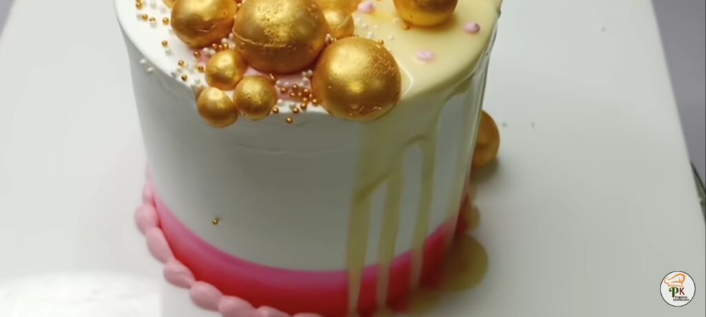 - shown in video. Place the golden chocolate balls and sprinkle some golden balls for decoration. Our Bubblegum Cake is ready.