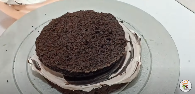- Place one layer, coat it with water and add whipped cream, chocolate ganache and Belgium chocolate essence. Mix it well and prepare a even layer.
