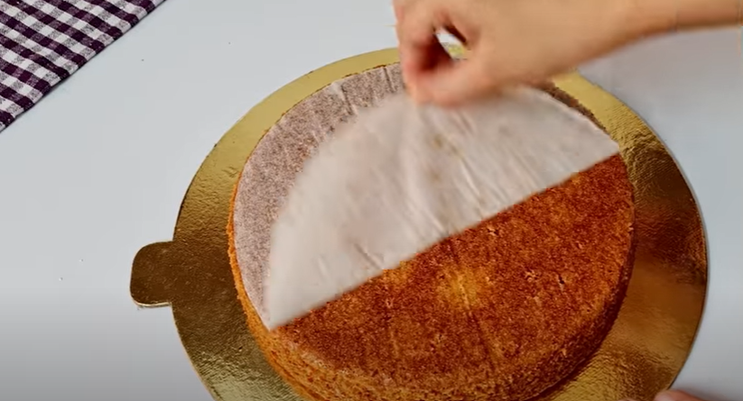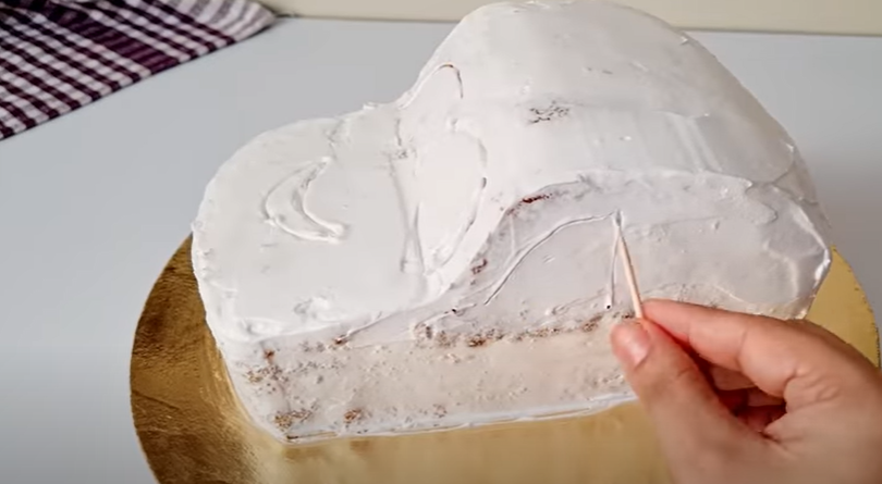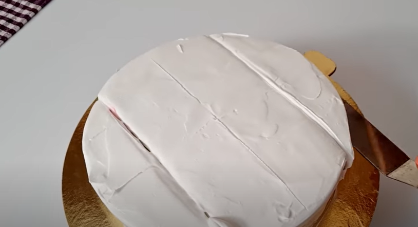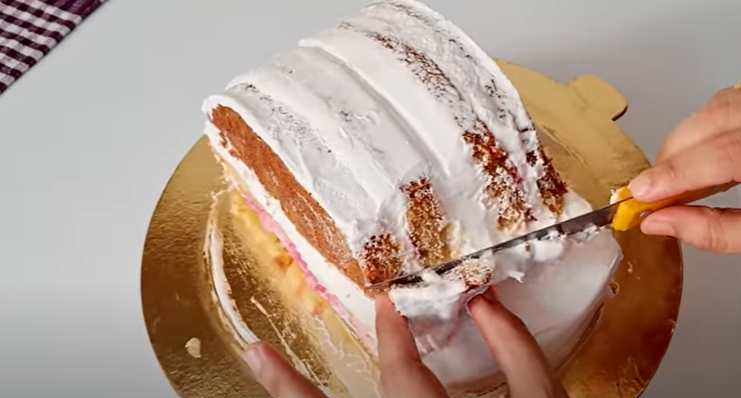 • Repeat the same process for the second layer of the cake. After crumb-coating the cake, make lines on it using a scale at equal intervals. Slice the two ends of the cake and place them on the remaining part of the cake as shown.