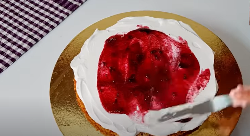 • Once the cake is baked and cooled, divide it into two equal parts. Place the first cake layer on a cake board, soak it with sugar syrup, and apply whipped cream to it. Spread evenly. Spread the blueberry crush over the cream and spread it evenly.