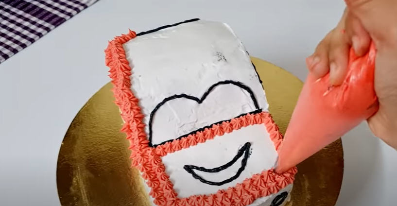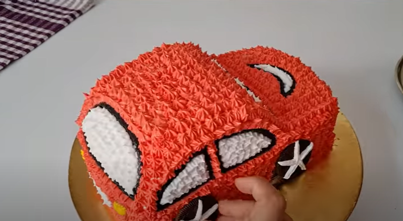• Make designs on the remaining part of the cake with red cream. Fill the front and back lights of the car with yellow cream. Fill the outlined part with white cream. Make wheels with Oreo biscuits as shown. Make grass patterns on the cake board with green cream.
