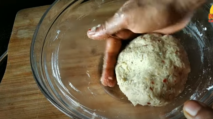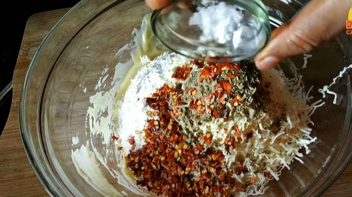 • Now add all-purpose flour, grated cheese, pepper powder, oregano, chilli flakes, and salt to it; crumble well, and knead to make a soft cookie dough.