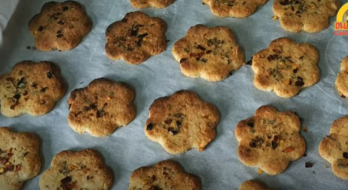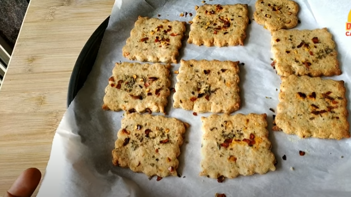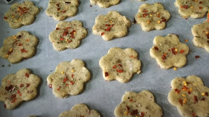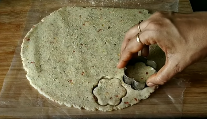 • Cut it into small cookies using a cookie cutter into flower-shaped or square shapes. Arrange the cookies on the baking tray. Sprinkle oregano and chilli flakes on each cookie and press.