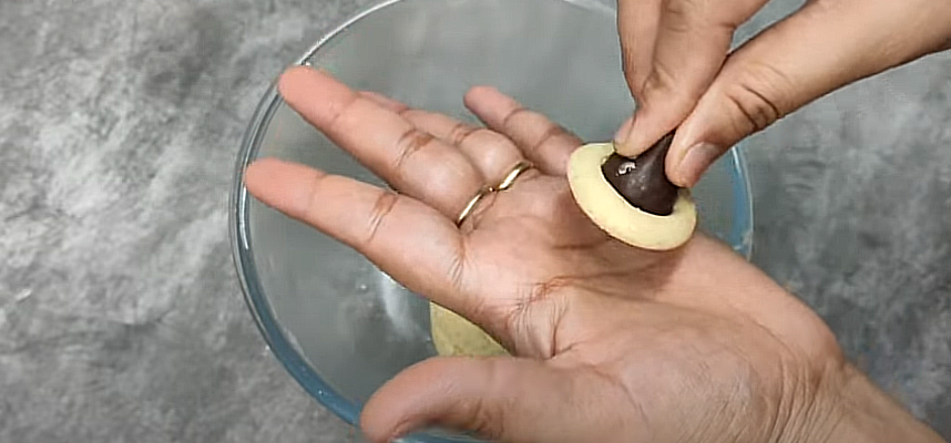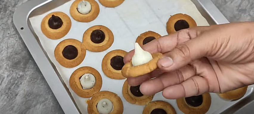 • Pinch small balls of dough and make them into the shape shown, then press them with kisses chocolate at the center. Similarly, make all the cookies from the dough.