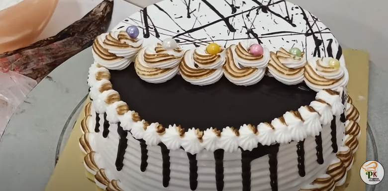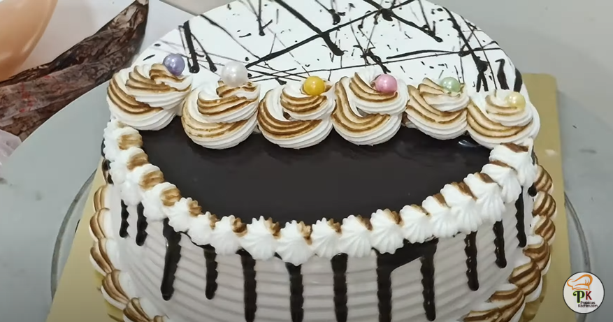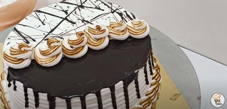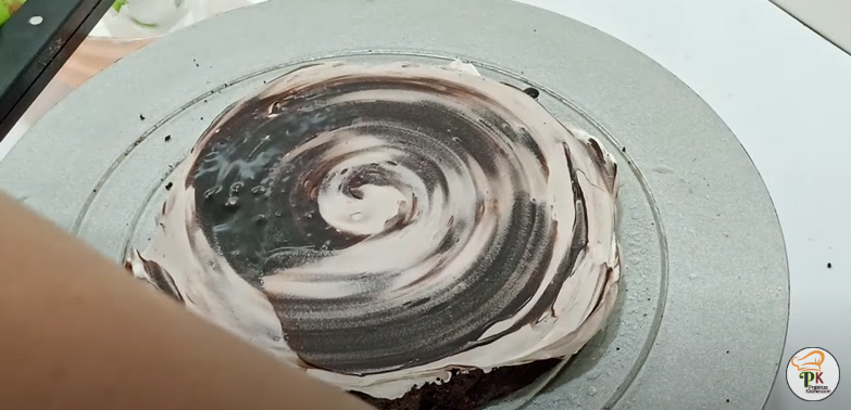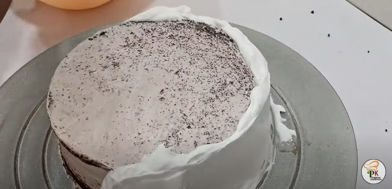• Do the crumb coating with same chocolate cream icing, and for frosting use plain white whipped cream. Even all the sides, remove extra cream.