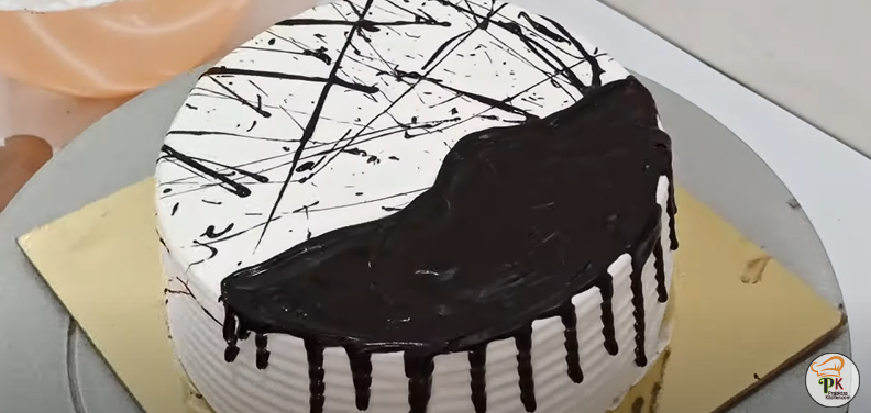 • With a triangle, comb card give the sides extra pattern. Next with help of finger tips, make a pattern of chocolate ganashe on one half of the cake as shown in the video.