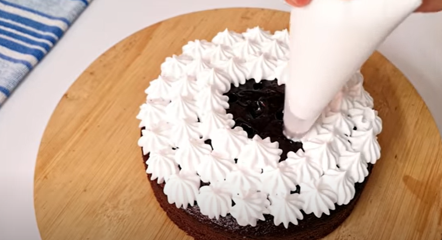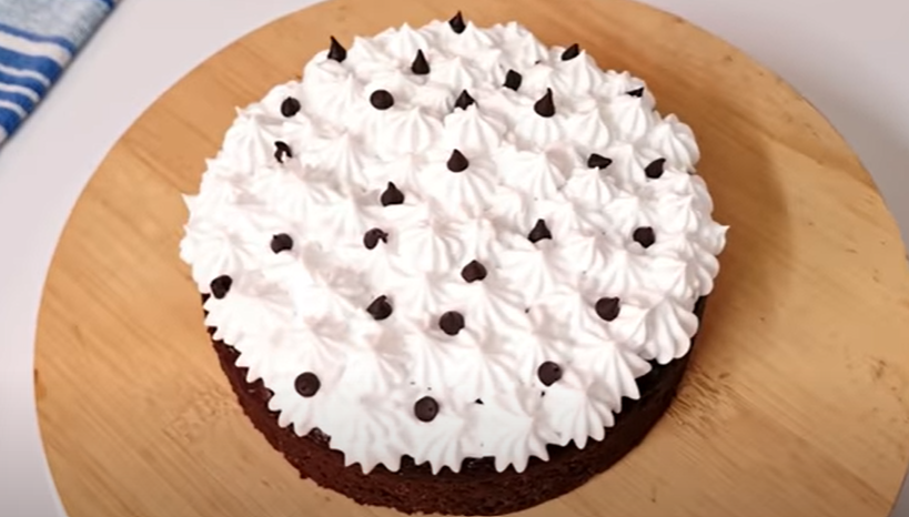 • Fill the holes with prepared chocolate ganache as much as possible. Make a floral pattern on the top of the cake with a nozzle as shown. Garnish the cake with chocolate chips. Your surprise chocolate cake is ready!