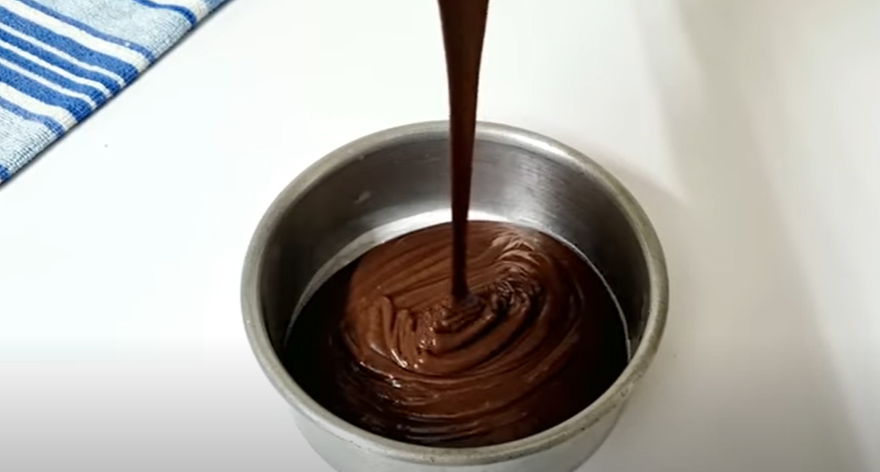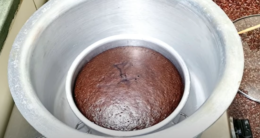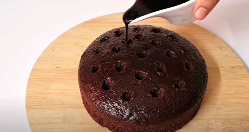 • Bake the cake for 40 minutes in a preheated kadai. Beat the whipping cream in a bowl until stiff peaks are formed. Prepare the chocolate ganache by melting chopped chocolate and hot cream. Poke holes in the cake with a chopstick.