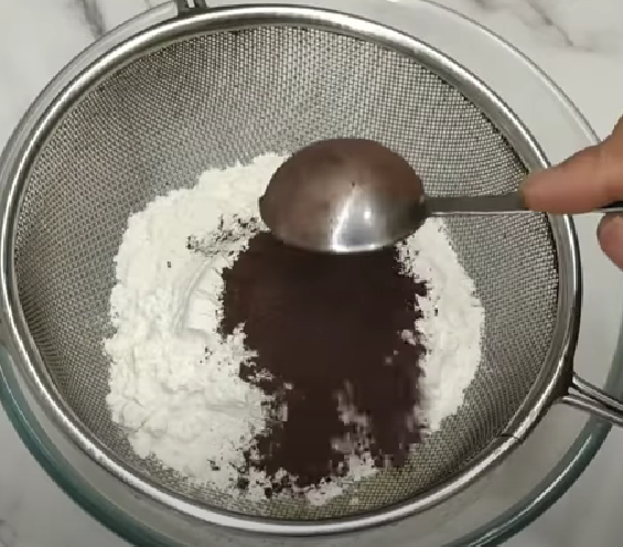 - To this add all-purpose flour, cocoa powder, baking powder, and baking soda through a sieve and whisk & mix it well.