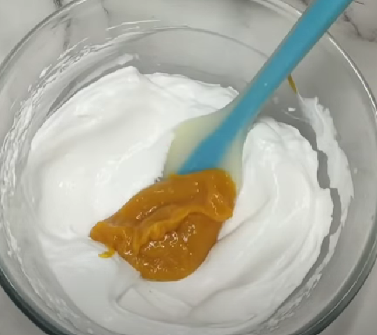 - Whisk whip cream until fluffy and add mango puree.