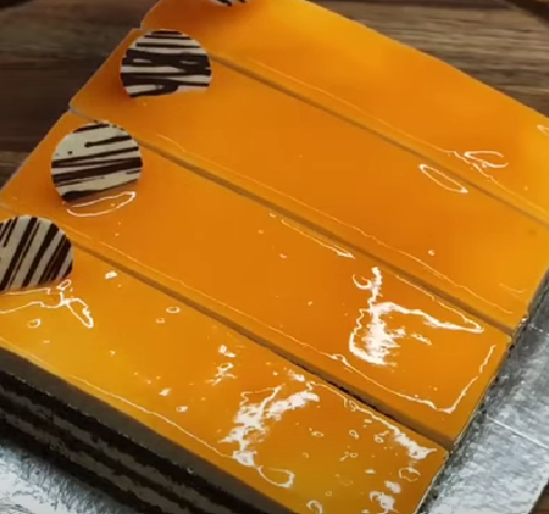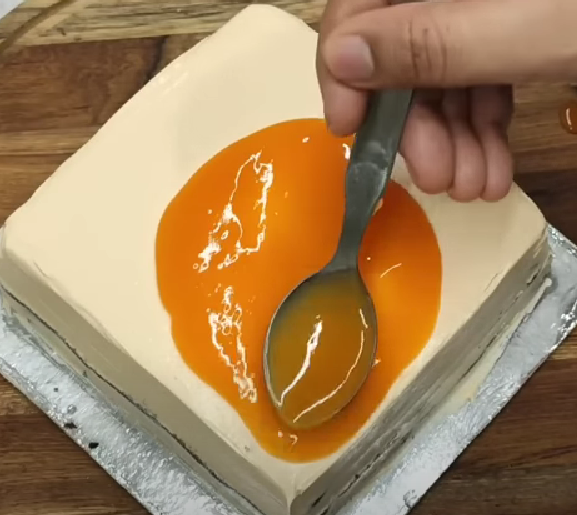 - Slice the cake into three layers, and apply sugar syrup, and mango frostings. Add mango glaze on top.
