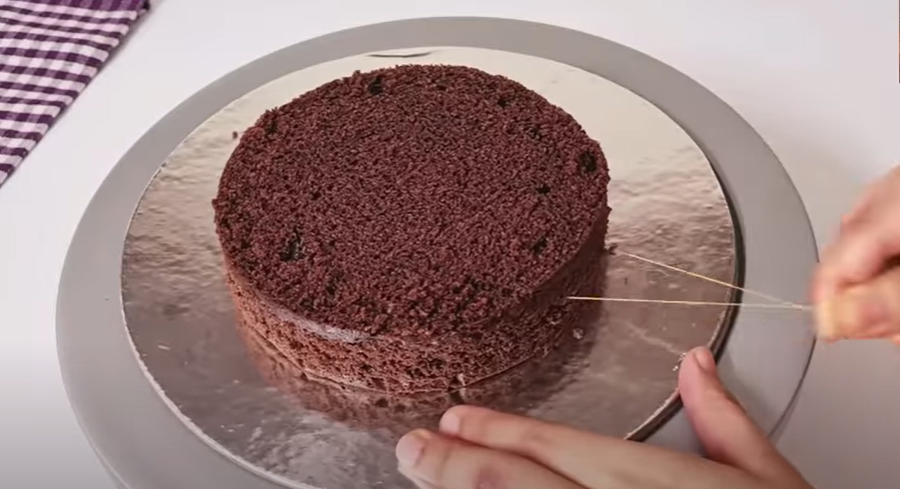 - Place the cake batter on the wire stand inside the cooker, cover it with the lid, and bake for 45–50 minutes on low heat. You can also bake the cake in a preheated oven at 170 °C for 35–40 minutes. Demould the cake after it's completely baked and let it cool completely. Divide the cake into 3 equal parts with the help of a knife and thread, as shown.