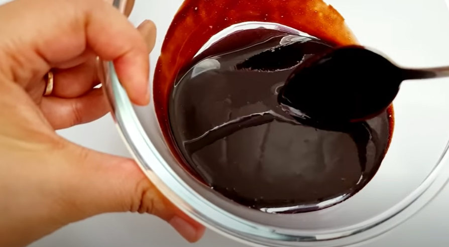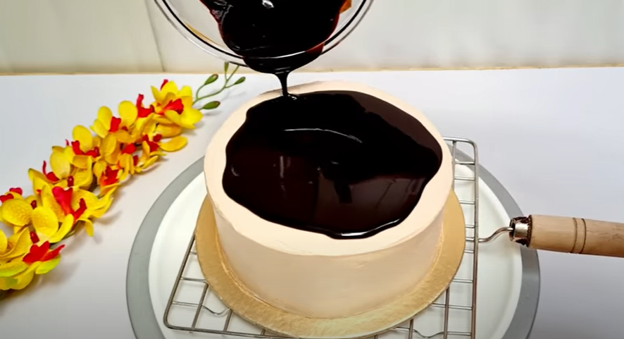 - When the mixture turns smooth and semi-thick as shown, the chocolate mirror glaze is ready. Strain the glaze into a bowl. Place a cake board on the board and spread some cream on it to make cake frosting. Place the first cake layer on top and brush with sugar syrup to moisten. Apply cream and smoothen a bit, then apply 1 heaped spoon of chocolate glaze on it. Repeat the process for 2 more cake layers.