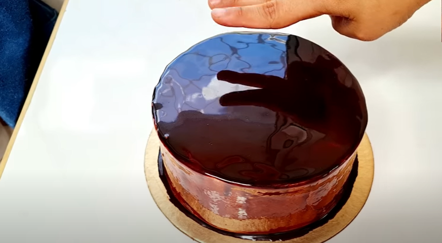 - Place the cake on a stand as shown. Pour the prepared chocolate glaze over the cake top. Coat the cake sides with glaze with the help of a spatula. Leave the cake like this for 2 minutes to set the glaze properly on the cake. Decorate the cake as shown or as per your wish. The Chocolate Mirror Glaze Cake is ready: perfectly shiny, glazy, and delicious.