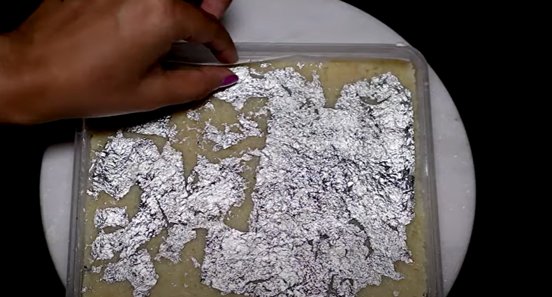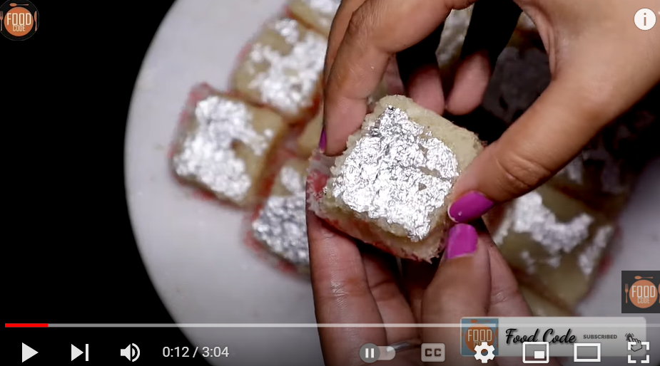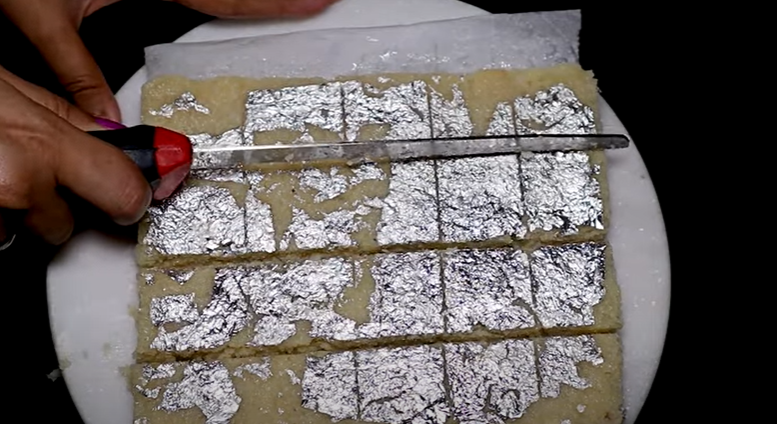 • Spread it evenly. Apply edible silver vark on it. Refrigerate it for about 2–3 hours. Cut them carefully into small pieces. Your coconut burfi is ready!