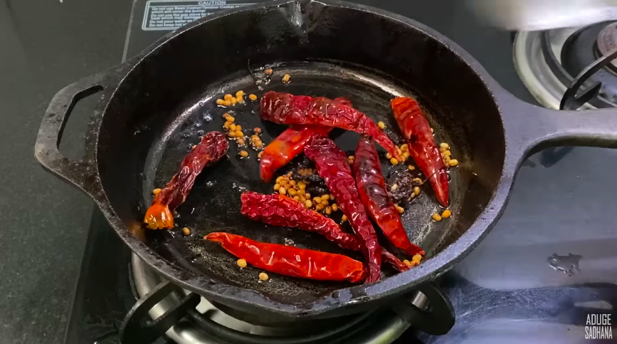 • At this stage, add 4 bydagi chillis & 4 nos. of guntur chillies and roast them until they puff up and slightly change colour. At this stage add 2 pinches of hing and mix it well.