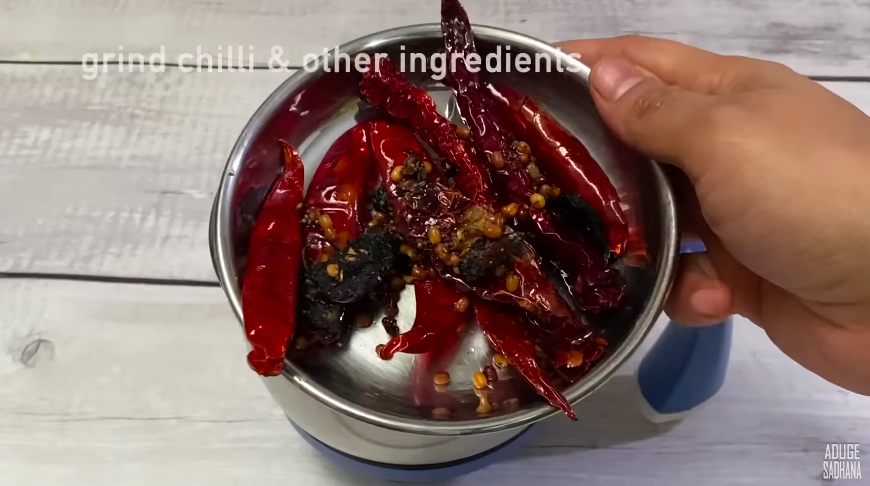 • In a mixer jar, first grind the roasted chillies and other ingredients to fine powder without adding water and then include roasted coconut gratings and grind it to fine paste/powder without adding water.