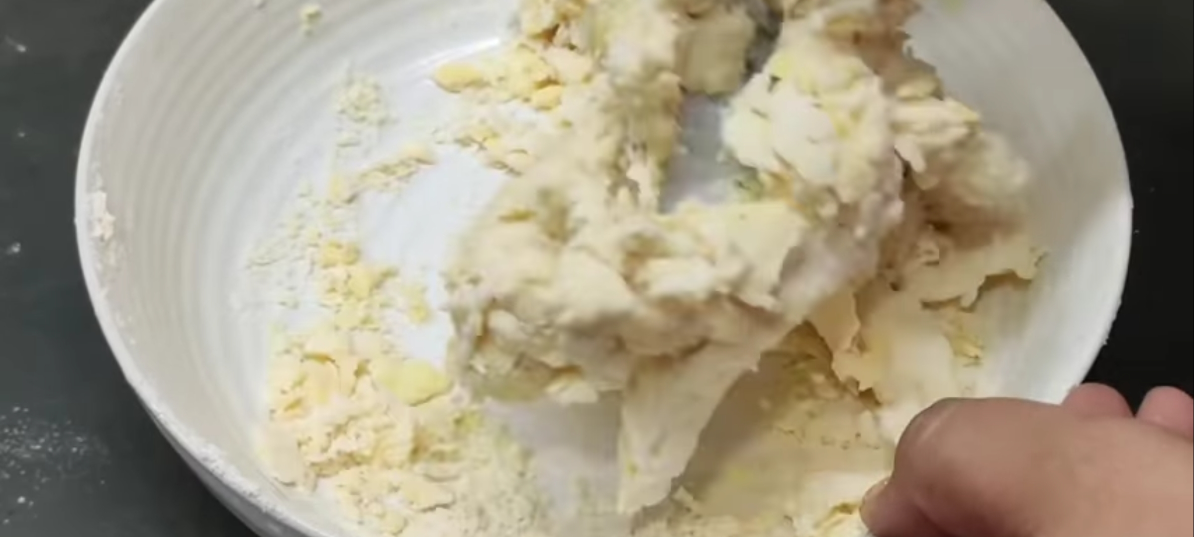 - Take water in a cup and add salt. Stir and mix. In a dish take all-purpose flour, cold butter and mix with a spoon. Do not use hands for mixing as butter can get melted. Add prepared salt water, mix again with a spoon. Make a dough.