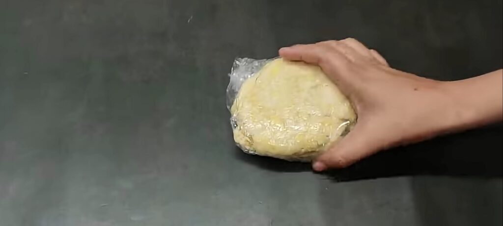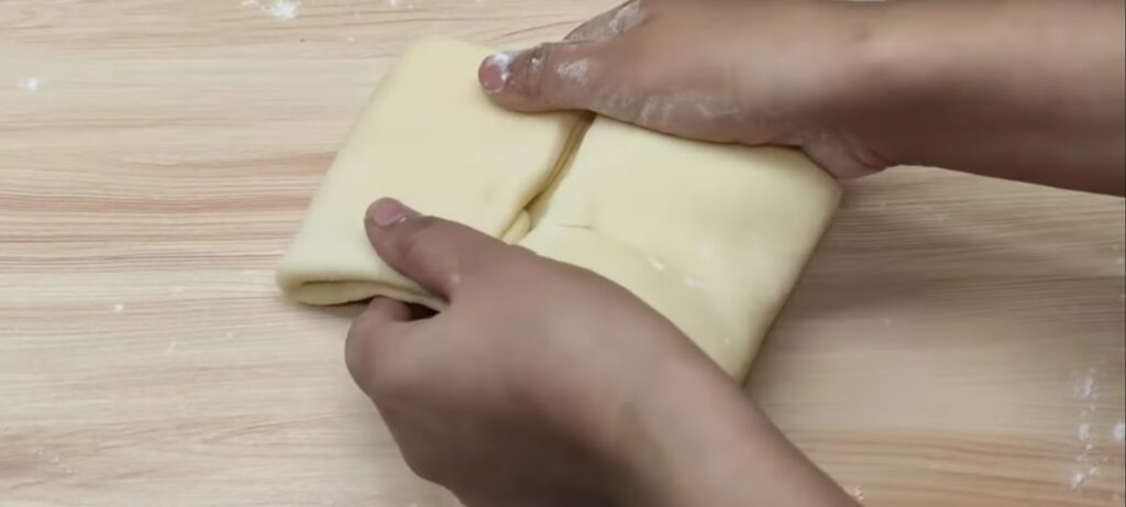 - Place the dough on plastic wrap. Cover the dough. Roll in a square shape. Refrigerate for 30 mins. After 30 mins remove wrap. Dust all-purpose flour. Roll and make a thick layer. Dust all-purpose flour.