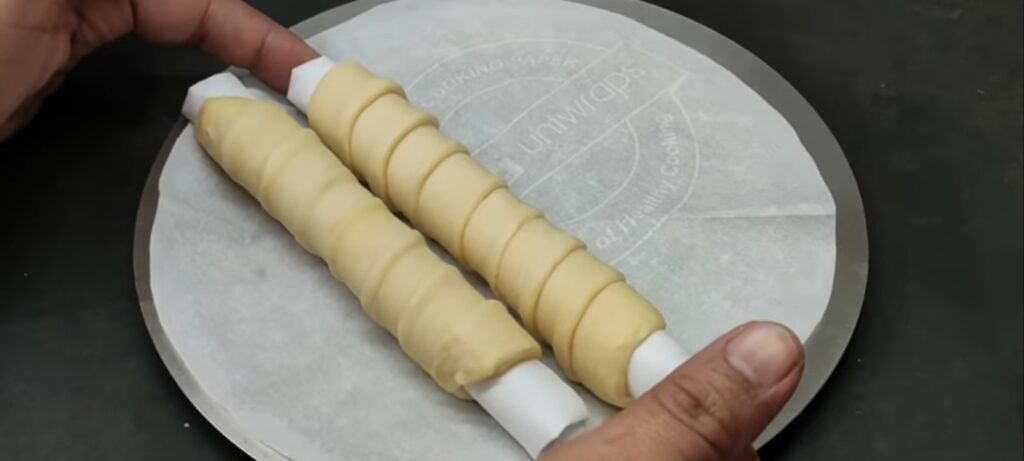 - Remove wrap from dough after 3o mins. Dust all-purpose flour. Roll and make a thin layer. Cut and keep aside for later use. Roll and make a thin layer. Cut small stripes. Wrap strips on mold.