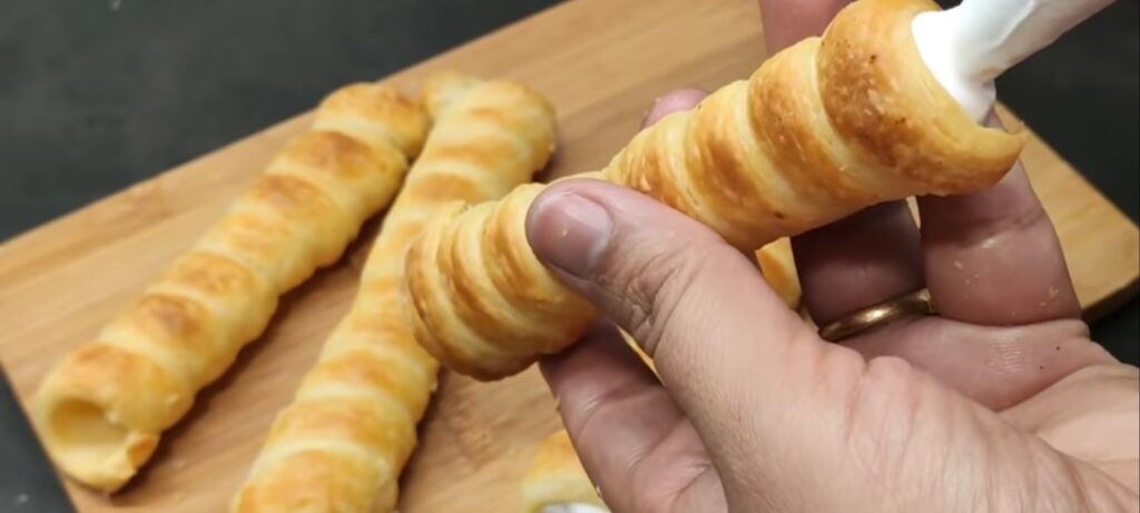 - In a bowl take whipping cream, whisk until fluffy. Remove mold. Fill cream in rolls. Flaky and mouth melting, perfect cream rolls ready.